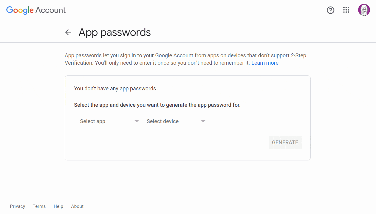 1. https://security.google.com/settings/security/apppasswords로 가서 귀하의 계정으로 로그인 하십시오.