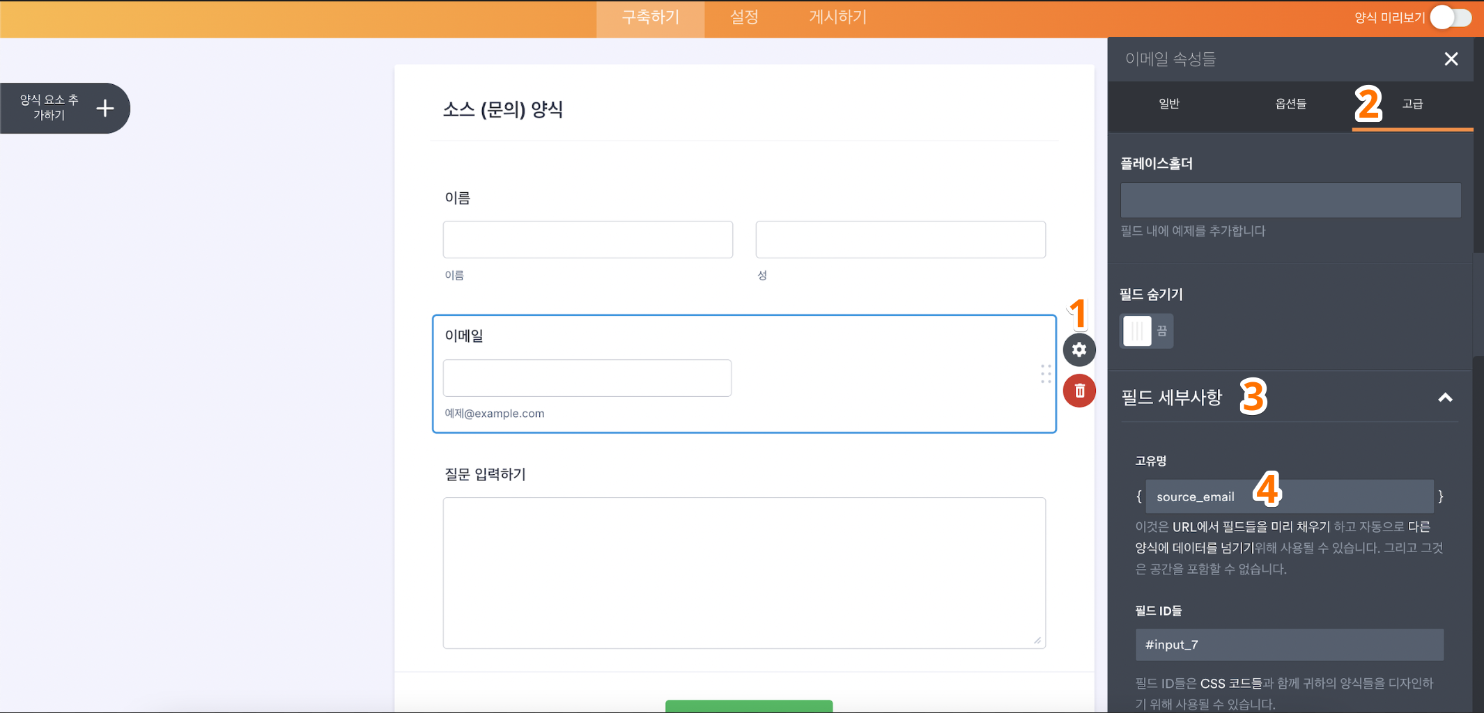 - 양식 빌더에서 상단의 설정을 선택합니다.