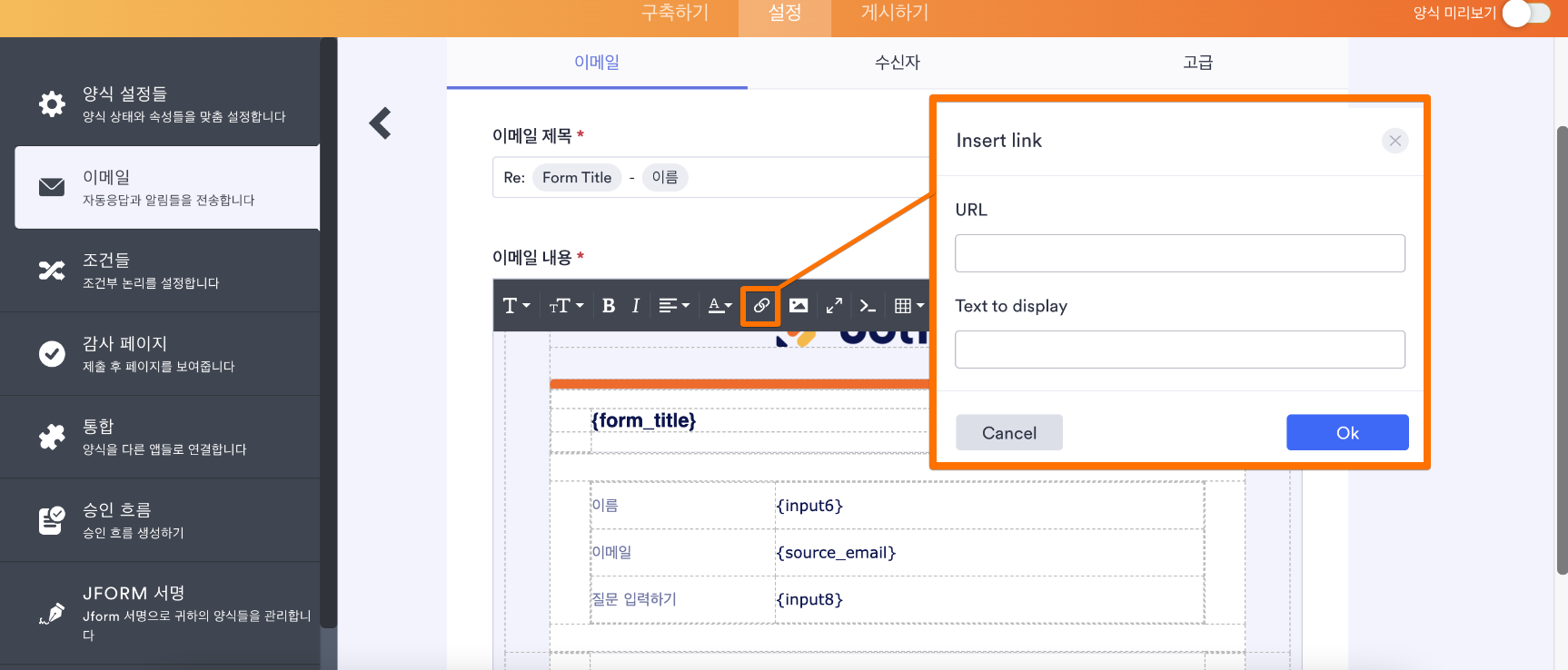 - 양식 빌더에서 상단의 설정으로 이동합니다.