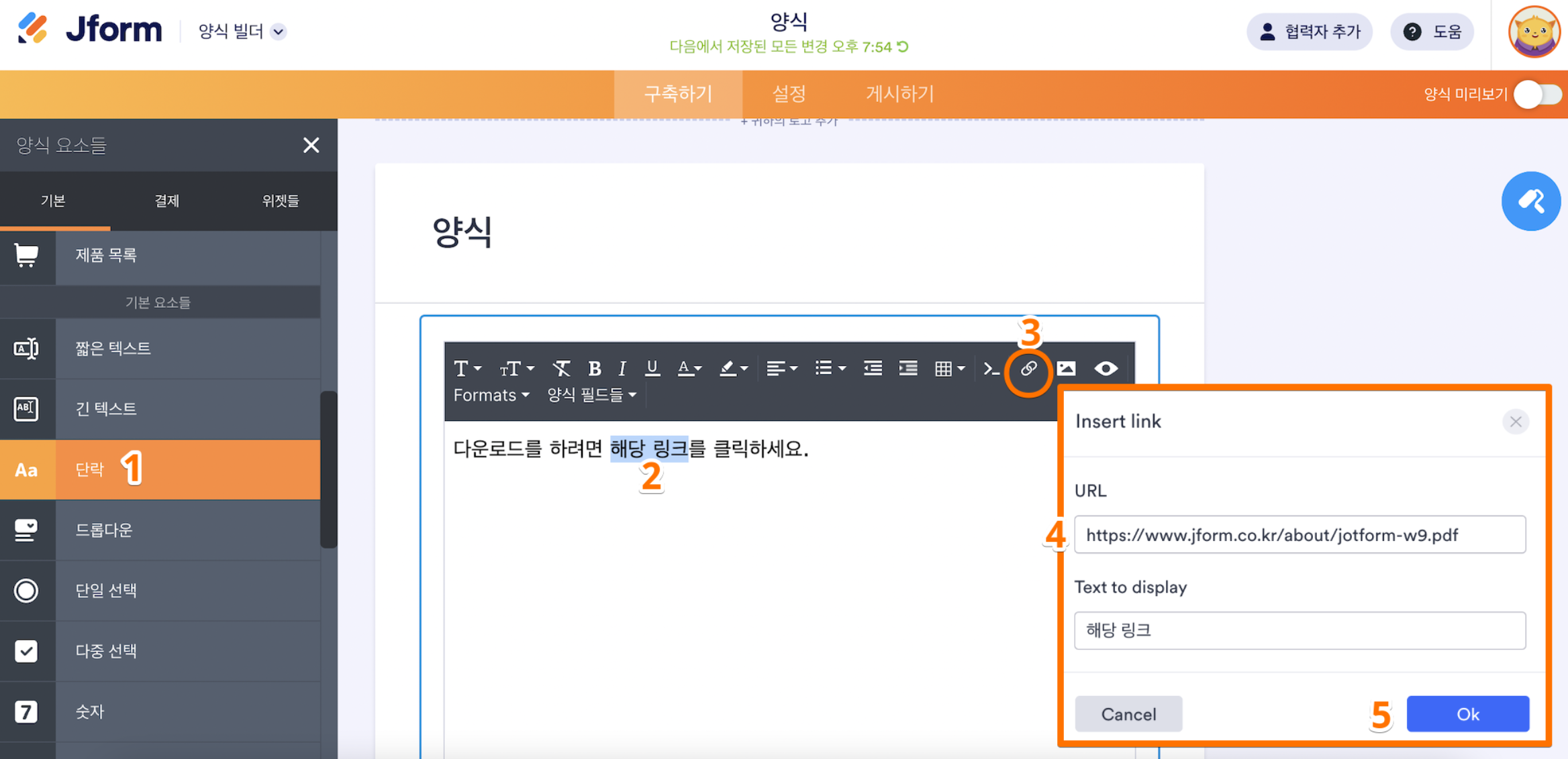 - 양식에 단락 요소를 추가하고 콘텐츠를 제공합니다(예: “파일을 다운로드하려면 해당 링크를 클릭하세요.”).