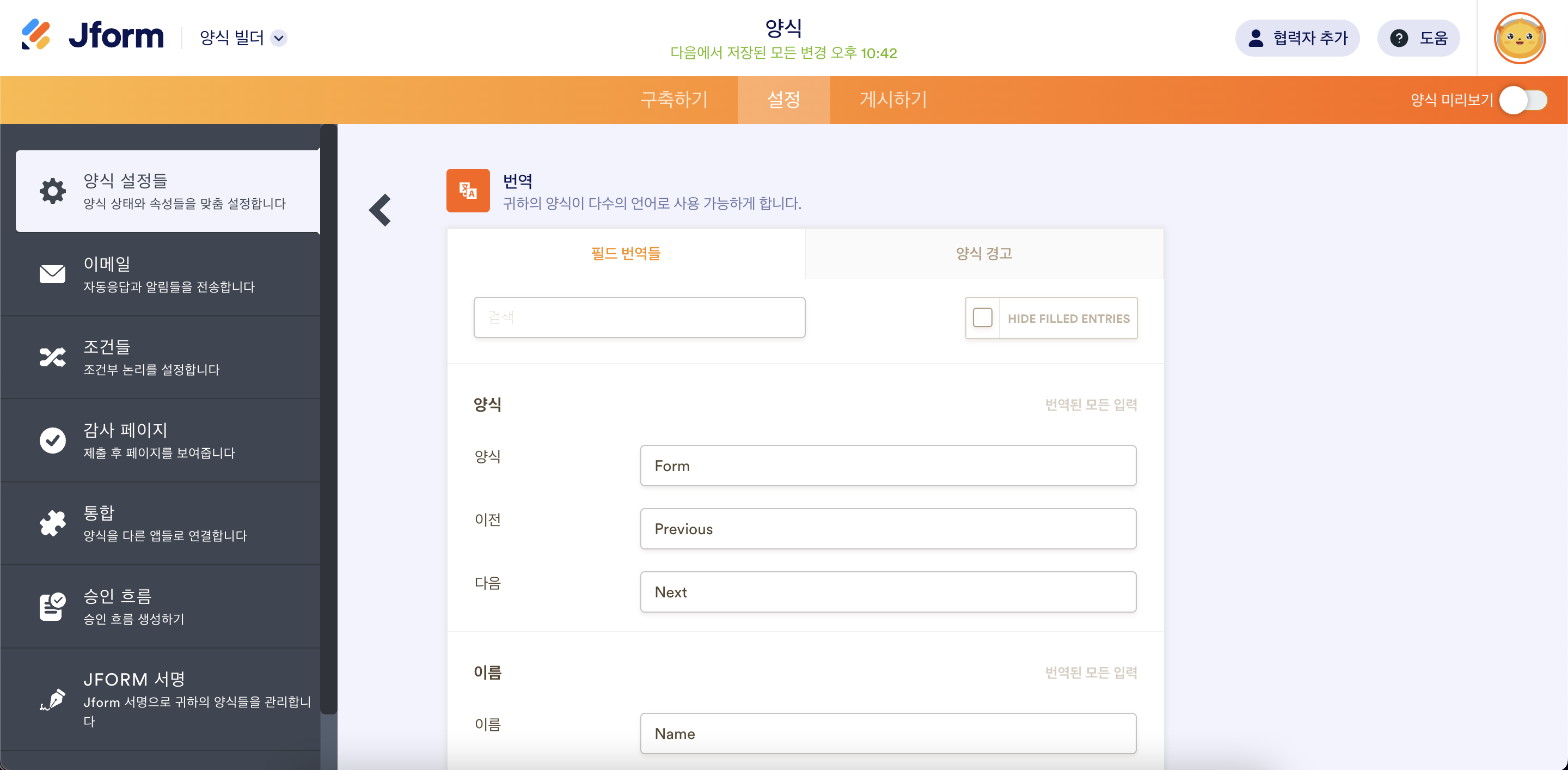 - 양식을 번역할 언어를 선택합니다.