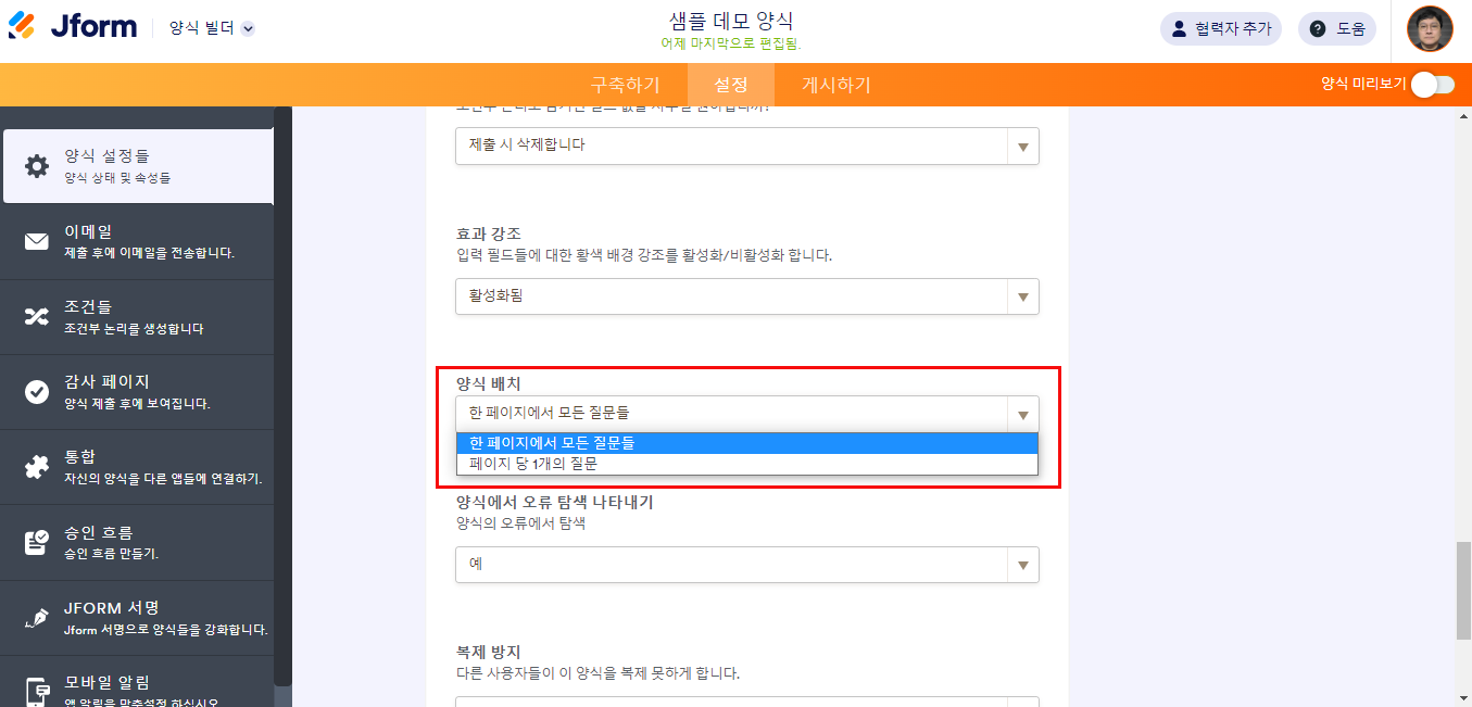 양식 설정을 통해 레이아웃을 바꾸시려면