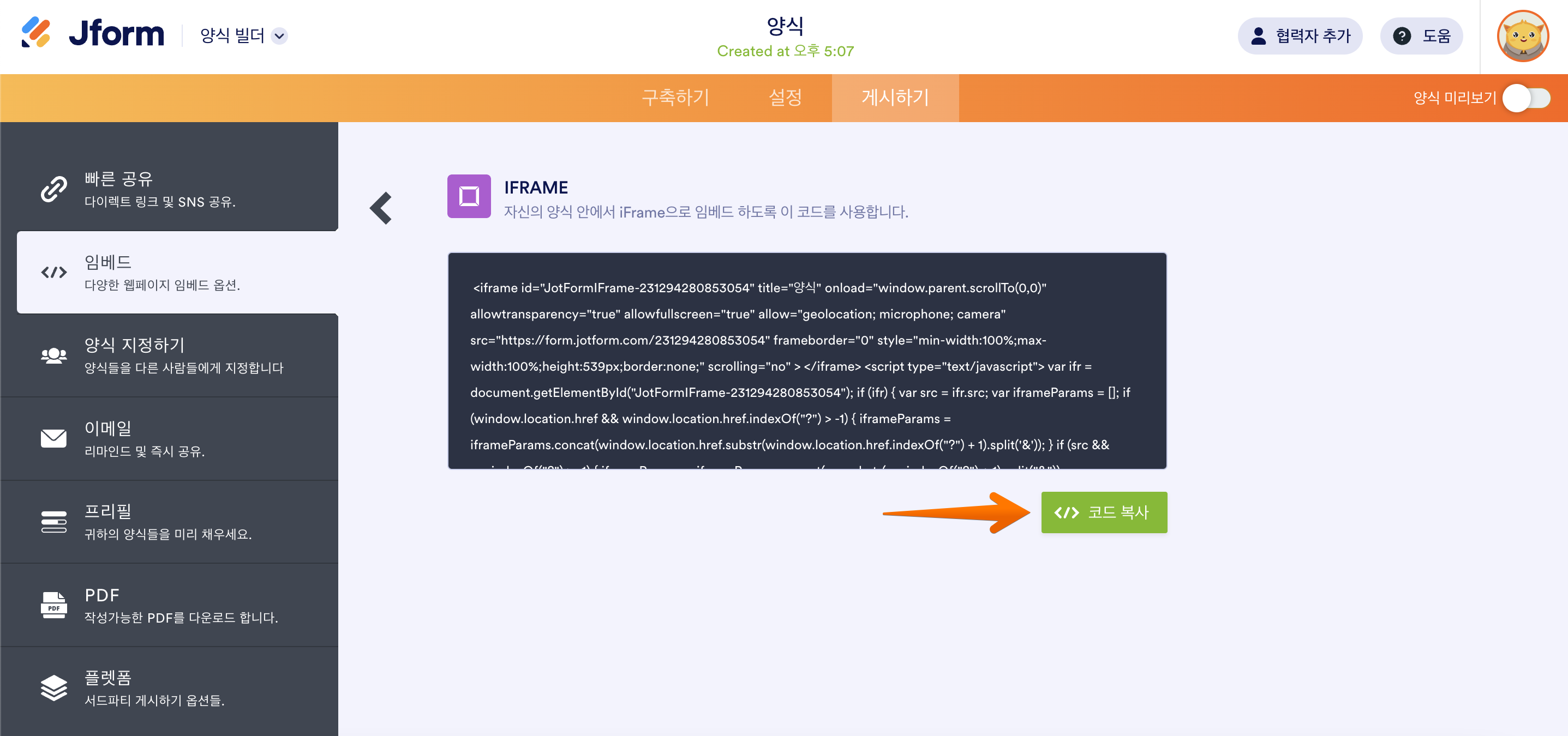 - 마지막으로 양식의 iFrame 코드를 복사하려면 하단에서 코드 복사를 선택합니다.