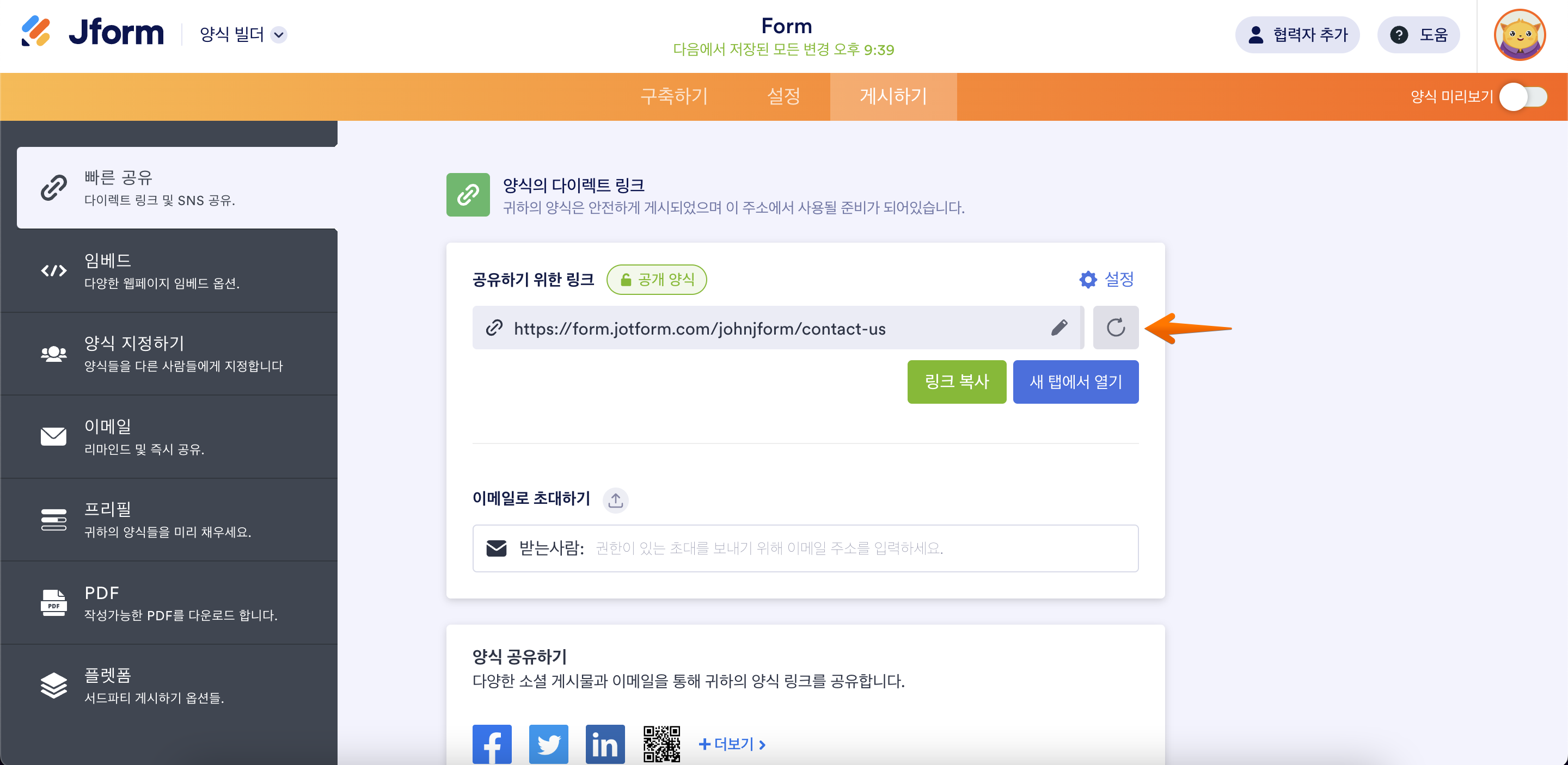 - 양식 빌더에서 상단의 게시하기를 클릭합니다.