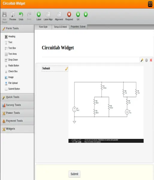 CircuitLab is an online tool designed to let users create, simulate, and share circuits in their web browsers. Whether you’re in product development, engineering, or IT, this widget works perfectly for your diagram and plotting needs. You can sketch a circuit with the online editor, then grab the circuit URL and paste it in your widget — no extra configuration required.