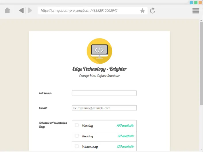 Let users book available appointments on a weekly basis with our free Weekly Appointment Planner. Choose the maximum amount of bookings per time slot per day and add the widget to your form to prevent overbooking and keep track of appointments online.